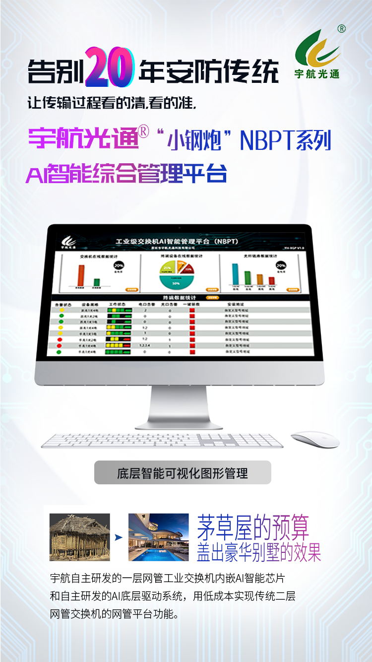 宇航專利產(chǎn)品:“小鋼炮”NBAI管理平臺(私有云),針對宇航自主研發(fā)的一層網(wǎng)管工業(yè)交換機內(nèi)嵌AI智能芯片和自主研發(fā)的AI底層驅(qū)動系統(tǒng),從而低成本實現(xiàn)傳統(tǒng)二層網(wǎng)管交換機的網(wǎng)管平臺功能。告別20年傳統(tǒng)安防傳輸方式,真正讓傳輸(過程)看的清,看的準,(傳輸數(shù)據(jù)統(tǒng)計)算的精。